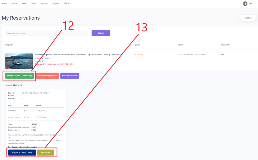 7c. After the boat owner approves your request, clients can receice an email reminder and go to Reservation Page, then make a payment ( Usually 20% rent for Deposit )