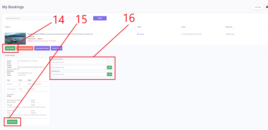 4b. click Issue Invoice button to check, then owners can Send Invoice if the invoice is right, or the owner adjust some fees on fields on the rightside and send. If needed, see detailed steps at Receive Booking or view Video Instruction